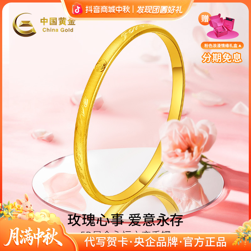 中秋国庆节【中国黄金】足金5D硬金玫瑰窄版情侣手镯时尚小众百搭